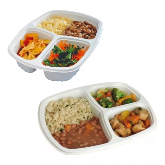 DESCRIÇÃO DO PRODUTO: A EMBALAGEM PP4H É UMA SOLUÇÃO PRÁTICA E EFICIENTE PARA ARMAZENAMENTO E AQUECIMENTO DE ALIMENTOS. FABRICADA EM POLIPROPILENO (PP) NA COR BRANCA, POSSUI TRÊS DIVISÓRIAS INTERNAS QUE PERMITEM SEPARAR DIFERENTES TIPOS DE ALIMENTOS EM UMA ÚNICA EMBALAGEM. CADA CAIXA CONTÉM 150 UNIDADES, CADA UMA COM CAPACIDADE TOTAL DE 1000 ML.