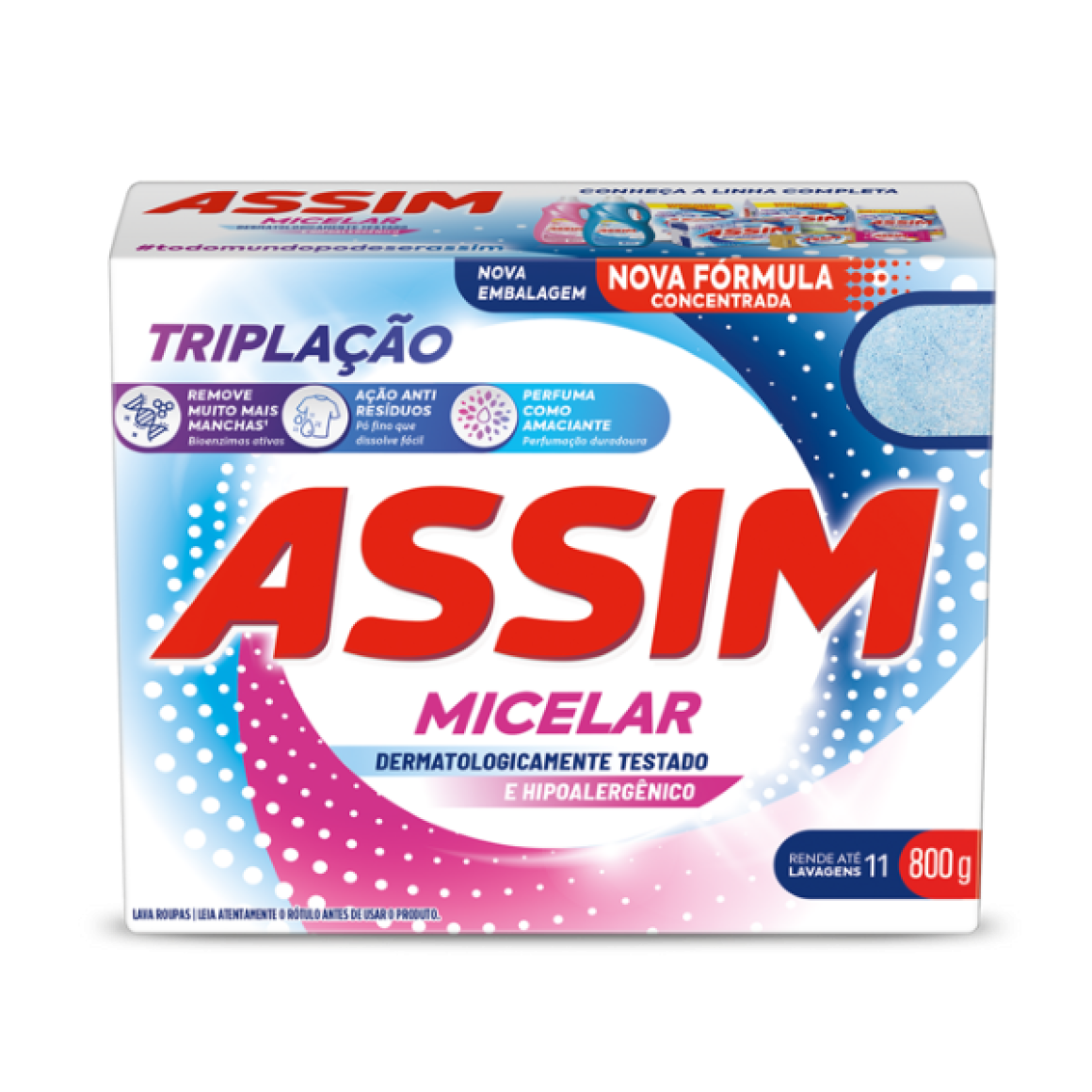 O SABÃO EM PÓ ASSIM 800 GRAMAS FOI DESENVOLVIDO PARA PROPORCIONAR UMA LIMPEZA PROFUNDA DAS ROUPAS, COM AÇÃO EFICIENTE NA REMOÇÃO DE MANCHAS E SUJEIRAS DIFÍCEIS. SUA FÓRMULA EQUILIBRADA PENETRA NAS FIBRAS DOS TECIDOS SEM DANIFICÁ-LOS, GARANTINDO ROUPAS MAIS LIMPAS, PERFUMADAS E BEM CUIDADAS. IDEAL PARA USO DIÁRIO EM LAVAGENS MANUAIS OU NA MÁQUINA, O PRODUTO É INDICADO PARA TODOS OS TIPOS DE TECIDO.