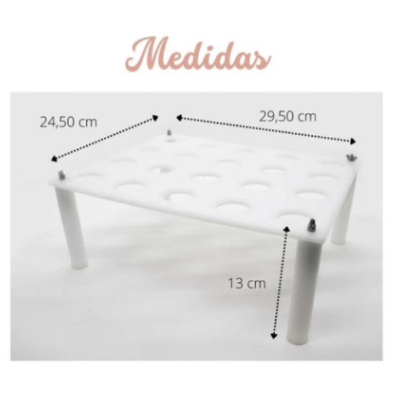 SUPORTE PARA CONE 24,5CM X 29,5CM – ALTURA 13CM. CONTÉM 5 PEÇAS (1 PLACA BASE + 4 PÉS DE SUSTENTAÇÃO). IDEAL PARA EXPOR E SERVIR CONES DE DOCES, SALGADOS OU SORVETES EM FESTAS, EVENTOS E BUFFETS. ESTRUTURA ESTÁVEL E FÁCIL DE MONTAR, TRAZ PRATICIDADE E ELEGÂNCIA À APRESENTAÇÃO DOS ALIMENTOS.